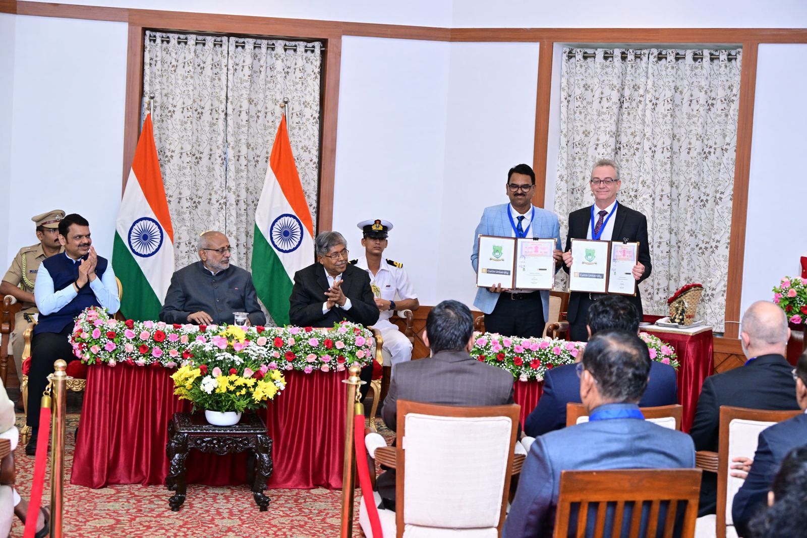 राज्यपाल सी. पी. राधाकृष्णन व मुख्यमंत्री देवेंद्र फडणवीस यांच्या प्रमुख उपस्थितीत गडचिरोली येथील गोंडवाना विद्यापीठाचे लॉयड मेटल्स एनर्जी तसेच पश्चिम ऑस्ट्रेलियातील कर्टीन विद्यापीठासोबत सामंजस्य करारांचे राजभवनात आज बुधवारी (दि. 7) आदानप्रदान करण्यात आले. यावेळी उच्च व तंत्रशिक्षण मंत्री चंद्रकांत पाटील, माजी मंत्री सुधीर मुनगंटीवार, आमदार परिणय फुके, ऑस्ट्रेलियाचे मुंबईतील वाणिज्यदूत पॉल मर्फी, कर्टीन विद्यापीठाचे प्रकुलगुरु मार्क ऑग्डन, गोंडवाना विद्यापीठाचे कुलगुरु डॉ. प्रशांत बोकारे, लॉयड मेटल्स कंपनीचे व्यवस्थापकीय संचालक बी. प्रभाकरन, उच्च व तंत्र शिक्षण विभागाचे अतिरिक्त मुख्य सचिव वेणुगोपाल रेड्डी, मुख्यमंत्र्यांचे सचिव श्रीकर परदेशी, राज्यपालांचे सचिव डॉ. प्रशांत नारनवरे तसेच विद्यापीठाचे संविधानिक अधिकारी व व्यवस्थापन समितीचे सदस्य उपस्थित होते.