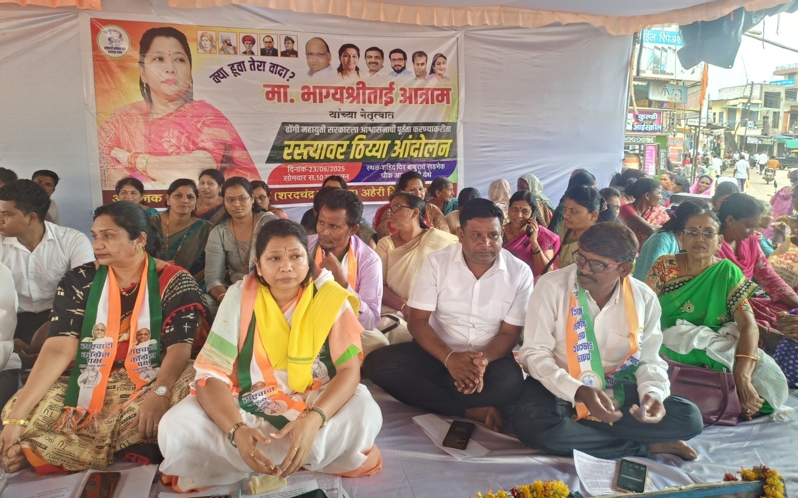 आंदोलनादरम्यान, जिल्हा परिषदेच्या माजी अध्यक्ष तथा राष्ट्रवादी काँग्रेस (शरद पवार गट) पक्षाच्या भाग्यश्री आत्राम म्हणाल्या की, विधानसभा निवडणुकीत महायुतीने जाहीरनाम्यात खोटी आश्वासने देऊन जनतेची दिशाभूल केली. सत्तेत आल्यानंतर एकही आश्वासनाची पूर्तता होताना दिसत नाही. उलट संजय गांधी, श्रावण बाळ निराधार योजनेचे व लाडकी बहीण योजनेचे पैसे मिळत नाही. जनता हवालदिल झाली आहे. ही ढोंगी महायुती सरकार आहे. आमदारांनी निवडणुकीपूर्वी जनतेला क्षेत्रातील रस्त्यांची समस्या प्रथम प्राधान्याने दूर करू, असे आश्वासन दिले होते. मात्र आज त्या आश्वासनांचा आमदारांना विसर पडला आहे, असा आरोप त्यांनी केला. लाडकी बहीण योजना आणि निराधार योजना दरमहा 1500 वरुन 2100 रुपये करण्यात यावे, डीबीटीच्या नावावर संजय गांधी व श्रावण बाळ योजनेचे अनुदान बंद करण्याचे थांबवून पूर्ववत सुरू करावे, शेतकऱ्यांना सरसकट कर्जमाफी द्यावी, धानाला प्रतीहेक्टर 25 हजार बोनस द्यावा, अंगणवाडी सेविका व आशा वर्कर यांना 15 हजार मानधन देण्यात यावे, रस्त्यांची दुर्दशा झाली असून त्वरित रस्त्यांचे कामे करण्यात यावीत, वनहक्काचे पट्टे त्वरीत देण्यात यावे आदी मागण्या आंदोलनात करण्यात आल्या. ठिय्या आंदोलनात राष्ट्रवादी काँग्रेस (शरद पवार गट) पक्षाच्या विभागीय अध्यक्षा शाहीन हकीम, प्रकाश ताकसांडे, श्रीनिवास विरगोनवार, नगरसेवक अमोल मुक्कावार, जहीर हकीम, अप्सर पठाण, हिमायत अली, स्वप्नील श्रीरामवार, सुमित मोतकुरवार, अहेरी क्षेत्रातील अहेरी, एटापल्ली, भामरागड, सिरोंचा व मुलचेरा तालुक्यातील अंदाजे 700-800 तरुण, तरुणी, वृद्ध तसेच कार्यकर्ते उपस्थिती होते.