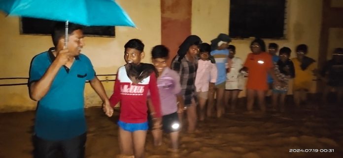 जिल्ह्याच्याच नव्हे तर राज्याचा टोक असलेल्या सिरोंचा तालुक्यात मागील दोन दिवसांपासून मुसळधारा सुरु आहेत. मागील 24 तासात तालुक्याला पावसाने अक्षरश: झोडपून काढले असून सिरोंचा महसूल मंडळात तब्बल 270.8 मिमी एवढा पाऊस कोसळला आहे. अशातच गुरुवारी रात्रीच्या सुमारास सिरोंचा मुख्यालयी असलेल्या सुभाषचंद्र बोस वसतिगृहात पाणी घुसल्याने विद्यार्थी प्रचंड घाबरून गेले. तत्काळ स्थानिक पोलिस जवानांनी विशेष मोहिम राबवित वसतिगृहात प्रवेश केला. यावेळी विद्यूत पुरवठाही खंडित झाल्याने अडचणी येत होत्या, यातही जवानांनी टार्चच्या सहाय्याने कमरेभर पाण्यातून सर्व 75 विद्यार्थ्यांना सुरक्षित बाहेर काढले. सदर मोहिम फत्ते करण्याकरिता सिरोंचा उपविभागीय पोलिस अधिकारी संदेश नाईक यांच्या नेतृत्वात पोलिस निरीक्षक समाधान चव्हाण, पोलिस हवालदार राकेश नागुला, प्रविण तोर्रेम, दिलीप उईके, राकेश करमे, नईक शेख आदींनी परिश्रम घेतले.
